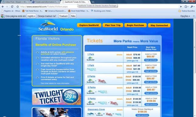 Vamos então começar pelos ingressos mais difíceis, que são os da Disney. Eles podem ser consultados e adquiridos no site oficial http://disneyworld.disney.go.com/.