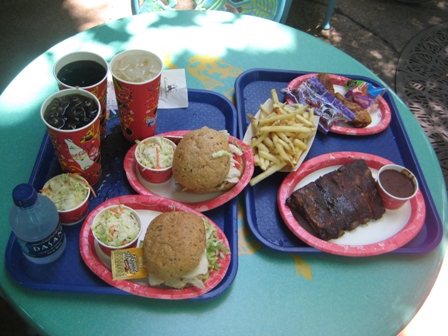 Quando bater a fome e você quiser fazer apenas um lance rápido, uma dica é Flame Tree Barbecue no Discovery Island bem na entrada da Dinoland. Lá tem umas costelinhas gostosas, mas os sanduíches de frango são meio sem graça e não recomendo.