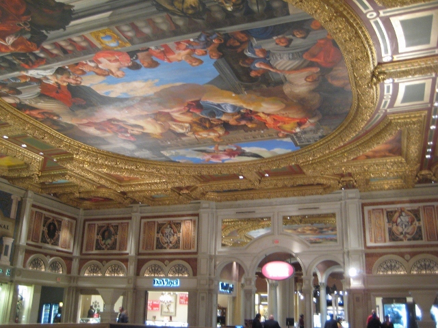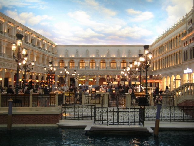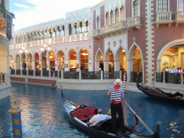 Na sequência ficam mais dois hotéis que são interligados por dentro: Palazzo e The Venetian. Apesar de serem do mesmo grupo, esse hotéis são bem diferentes entre si, pois foram construídos em épocas distintas e nos estilos que imperavam então. O The Venetian é mais antigo, e como o próprio nome já diz, é todo inspirado na cidade de Veneza. O hotel é lindo e tão bem feito, que você se sente realmente na cidade italiana! Eles reproduziram as praças e até os canais com as gôndolas, que aqui também custam bem caro para dar uma voltinha. As lojas são bem incrementadas e a arquitetura é muito chique. Eu diria que é um dos meus hotéis preferidos na cidade e muito gostoso para se caminhar por dentro. O teto, que é uma marca de vários hotéis da cidade, reproduz o céu de forma muito real, portanto em alguns momentos você tem até a impressão que está caminhando a céu aberto. Para quem gosta, ou nunca foi, no Venetian se encontra também uma das filias do famoso museu Madame Tussauds, com seus bonecos de cera de personalidades famosas.
