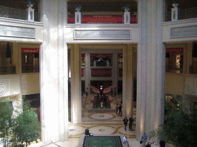 O Palazzo é bem recente e já segue outro estilo completamente diferente, com um interior mais modesto que lembra mais um shopping center qualquer. Tem até uma cascata bonita, mas sinceramente não achei muita graça nesse hotel e o considerei completamente sem personalidade. Apesar deles serem conectados e parecer ser um só por dentro, as diferenças no estilo são tão gritantes que não tem como você não perceber que está trocando de hotel.