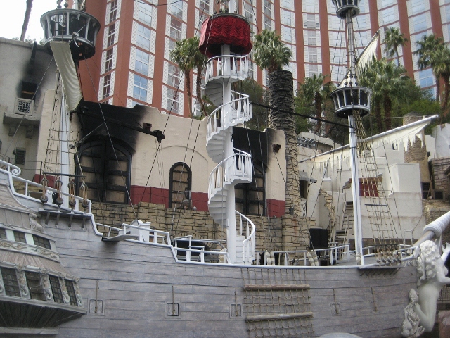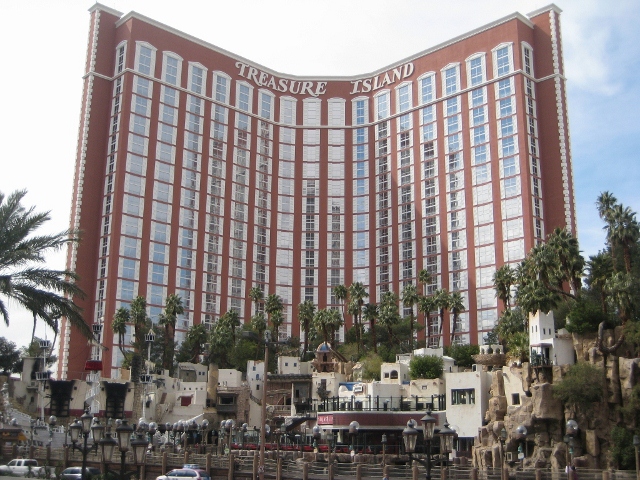 O outro hotel é o Treasure Island, que tem até uma ligação gratuita com o Mirage através de um monorail, algo muito comum em Las Vegas. É importante ficar atento a esses detalhes, pois você anda muito e qualquer meio de transporte ajuda a descansar um pouquinho. Esse hotel também é antigo e um pouco simples, sendo seu tema principal os piratas. Logo na entrada eles reproduziram uma vila com um lago, navio pirata e uma ponte, de onde é possível assistir a um show gratuito de teatro com fogos de artifício todas as noites em vários horários.