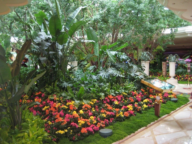 Continuando para o sul chegamos finalmente na parte mais nobre e interessante da Strip e onde ficam os hotéis mais novos. Os primeiros são o Encore e Wynn, que pertencem ao mesmo grupo e são muito parecidos. Eles têm um visual bem moderno, arrojado e luxuoso e não são temáticos, seguindo a linha dos hotéis mais recentes da cidade. Por dentro é tudo muito elegante e florido, com seu jardim de inverno e cascatas bem interessantes e diferentes. As flores são realmente lindas e a decoração é toda de muito bom gosto! As lojas seguem a mesma linha chique e são na sua maioria de grife e caras, o que no meu caso significa só observar e apreciar, já que comprar está fora de questão. O cassino também é moderno e interessante, mas existem outros mais bonitos. Os corredores para passear não são muito extensos, portanto dá para visitar esses hotéis em pouco tempo.