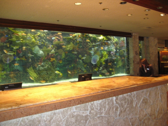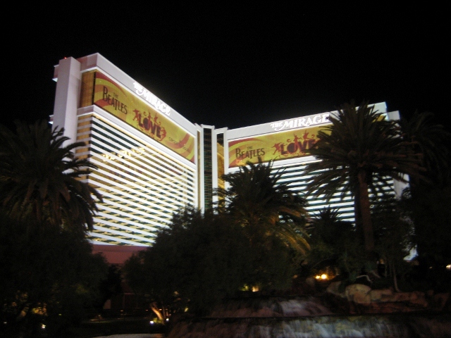 Em frente ficam mais dois hotéis de outro grupo, ambos mais antigos. O primeiro é o Mirage, onde acontece o show do Cirque du Soleil Love, em homenagem aos Beatles, mas que contarei melhor em outro post específico. A decoração do hotel em si não tem grandes atrativos, mas mesmo assim atrai muito jogadores para o seu cassino. Para quem não gosta de jogar, vale a pena visitar sua recepção, que conta com um imenso aquário ao fundo e muito bonito, diversão certa para a garotada. Outra atração interessante para os pequenos é o Jardim Secreto dos mágicos Sigfried & Roy, que é uma espécie de mini zoológico de animais selvagens, como tigres, leões, panteras, etc.. A noite ainda rola um show gratuito a cada 15 minutos, onde eles simulam a erupção de um vulcão com muito fogo e água. Infelizmente acabei esquecendo de tirar mais fotos do hotel. 😦