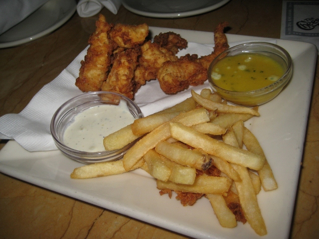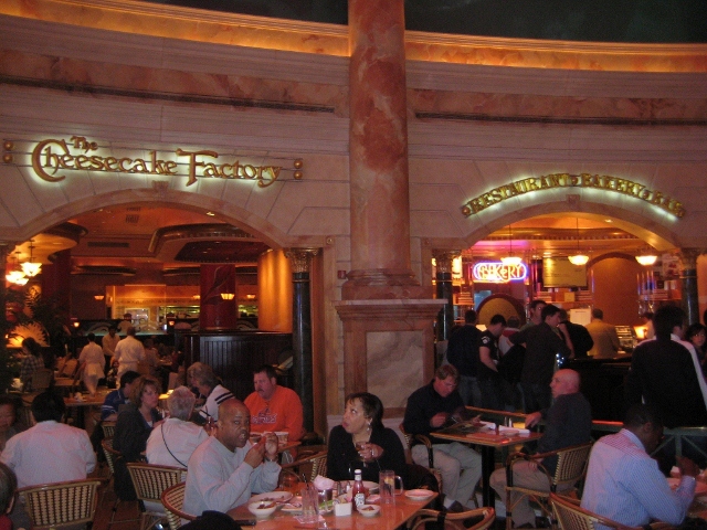 No quesito restaurantes à la carte, recomendo bastante o The Cheesecake Factory no Hotel Caesars Palace. Já comentei outras vezes sobre essa rede aqui no blog, já que ela está presente nos EUA inteiro e oferece um excelente custo-benefício, além é claro das maravilhosas cheesecakes. Apesar de ser uma rede imensa, seus pratos são bem incrementados e fogem do padrão comum, sempre misturando ingredientes e temperos interessantes. A qualidade da comida é excelente e o preço é justo! Para o meu filho pedimos o tradicional chicken fingers com batata fritas. Já minha esposa foi de frango recheado com queijo e coberto com presunto parma, acompanhado de spaghetti ao molho branco. Eu optei por um filé ao molho de vinho tinto e champignon, acompanhado de purê de batata com alho. Tudo uma delícia!