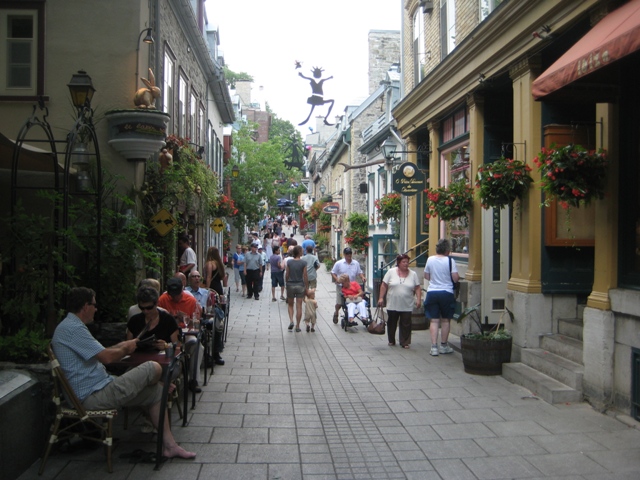 Chegando lá em baixo você percebe que a cidade pode ser ainda mais encantadora! Achei essa região uma das mais bonitas da cidade, cheia de ruazinhas charmosas com construções bem típicas. Parece que realmente estamos em alguma cidade pequena do interior da França! Comece o passeio pela bela Rue du Petit-Champlain, que fica a direita do funicular e é considerada a rua mais estreita da América do Norte. Ela é repleta de lojas, restaurantes e cafés bem típicos, com mesas ao ar livre e praças bem floridas. Não tem como você não se sentar em dos bancos para observar o movimento e curtir a arquitetura das construções, pois o clima é bem gostoso!