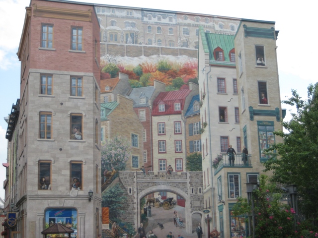Se você continuar caminhando pela Rue Notre Dame e atravessar a praça, logo em seguida vai se deparar com um belo painel pintado na parede de um dos prédios, que retrata uma Quebec dos velhos tempos. É tão bem feito que as vezes dá até a impressão que é real!