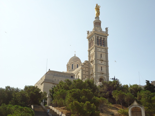 Subindo um pouco a partir do região do porto se encontra a atração da cidade que eu considero imperdível: a Notre Dame de La Garde. Ela fica no alto de uma montanha com um visual fantástico de toda a cidade e o mar, justamente com objetivo de proteger todos os navegadores. O visual em si já vale a visita, mas o melhor fica por conta da própria igreja, que é belíssima! Seu interior é decorado por diversos mosaicos e vários quadros, que em conjunto com seus pilares listrados formam um agradável ambiente para se observar.