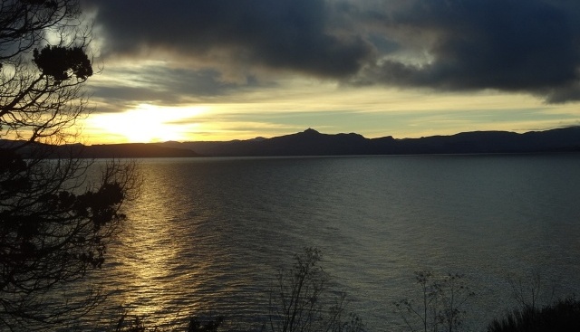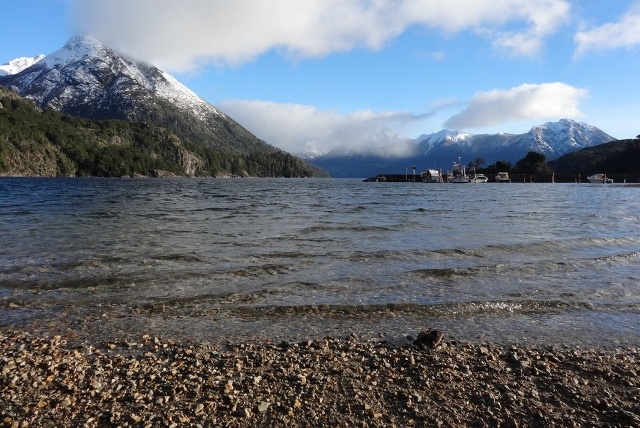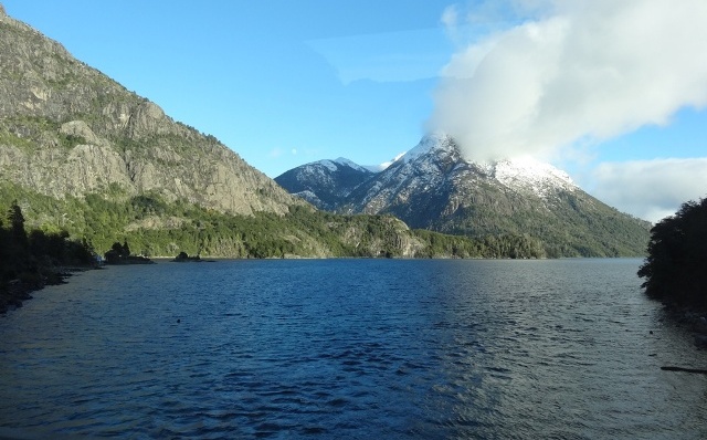 Bem, vamos então ao passeio em si. Conforme já mencionei, a primeira parte do Circuito Chico é feito percorrendo a Avenida Exequiel Bustillo e beirando o belo lago Nahuel Huapi. Não saltamos da van em nenhum momento nesse trecho, mas o motorista parou em alguns pontos para tirarmos fotos pela janela mesmo. Como saímos as 9 horas do hotel, pegamos um sol ainda nascendo aos poucos e a paisagem do lago estava belísssima.