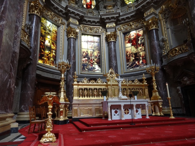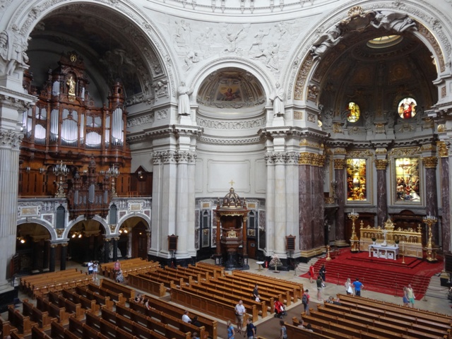 Atravessando a ponte você chega a Ilha dos Museus, que é uma das regiões mais turísticas da cidade, o que não é por acaso, já que ela conta com várias atrações imperdíveis. Foi justamente ali que visitamos as duas atrações que mais gostamos em toda a cidade! A primeira delas é a belíssima Catedral de Berlim, também conhecida como Berliner Dom. Sua imponente fachada é lindíssima e chama a atenção de qualquer visitante, mas foi o seu belo interior que mais nos conquistou. É tudo muito bonito, portanto tire um tempo para se sentar e observar todos os detalhes com calma. A entrada é paga, mas vale cada centavo! Depois de observar tudo de baixo, pegue as escadas para ver o visual do interior catedral do alto também.