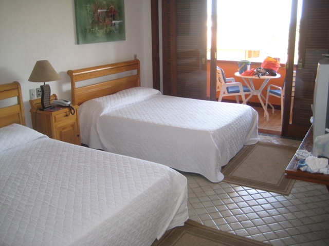 O hotel oferece 4 tipos de suítes: Superior, Luxo, VIP e Ferradura, sendo as duas últimas com hidro. Escolhemos a superior que era a mais barata, mas que se provou muito boa. O quarto era amplo e confortável, com duas camas de casal e um belo visual do restante do hotel e um pouco do mar.
