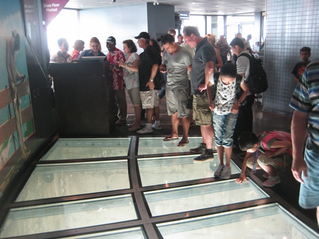 Uma das principais atrações lá em cima é passear pelo piso de vidro, não recomendado para quem tem medo e alturas. Eu esperava que ele fosse maior, portanto me decepcionei um pouco, mas mesmo assim é bacana.