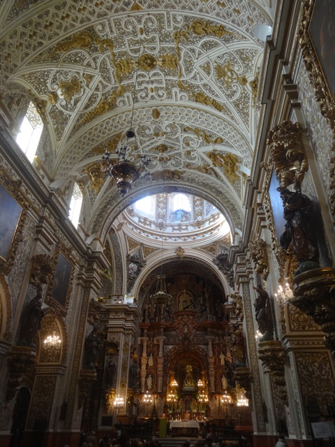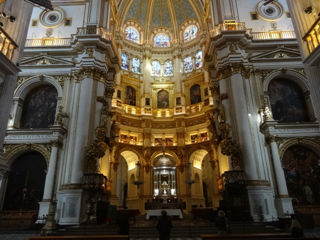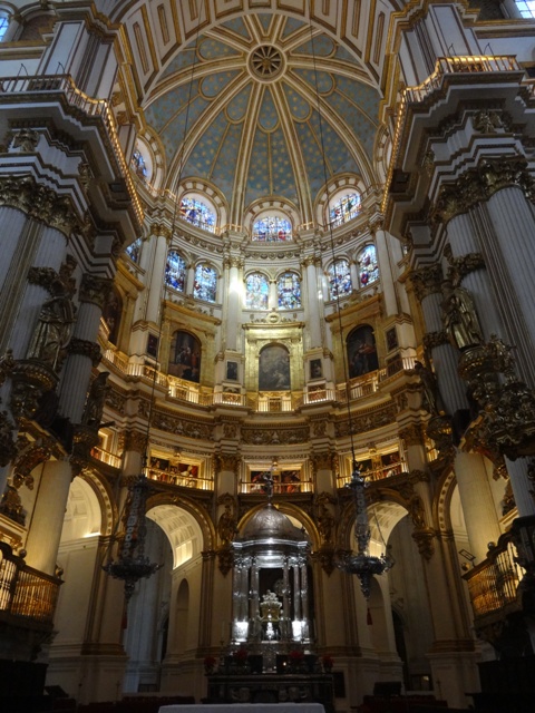 Caminhando pelas ruas do centro fomos visitar em seguida a imponente e belíssima Catedral de Granada. Sua altura realmente impressiona e seu interior também não decepciona, com várias partes folheadas a ouro. Muito bonita!