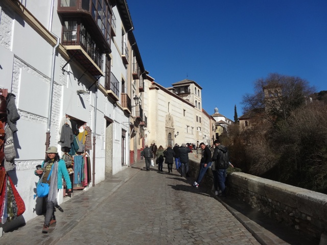 Quando se chega lá embaixo você inevitavelmente deve se deparar com a Carrera del Darro, que é uma ruazinha linda estreita de parelepípedo que fica justamente espremida entre os dois morros, separando assim Albaicín de Alhambra. Essa ruazinha ainda divide espaço com um riacho que tem várias lojas com produtos típicos da cultura moura e alguns monumentos interessantes. São quase 400 metros de rua que valem a pena ser percorridos com calma.