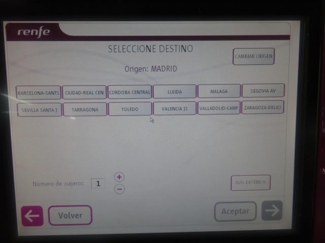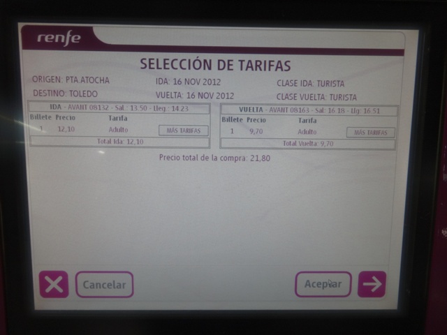Para chegar em Toledo a melhor forma é pegar um trem rápido na estação Atocha no centro de Madri, que leva menos de 30 minutos e é super confortável e prático. Não podia ser melhor! Você pode comprar a passagem nos próprios terminais de auto-atendimento que existem na estação, que são bem fáceis de usar e evitam a fila das cabines de venda. O único porém é que nesse caso você tem que obrigatoriamente pagar com cartão de crédito ou débito, já que a máquina não aceita dinheiro. Não aconselho comprar com antecedência, pois tem trem praticamente o tempo todo e quase sempre tem vaga disponível no próximo. Veja abaixo o passo-a-passo para realizar a compra nos terminais (Clique nas imagens para vê-las em tamanho maior).