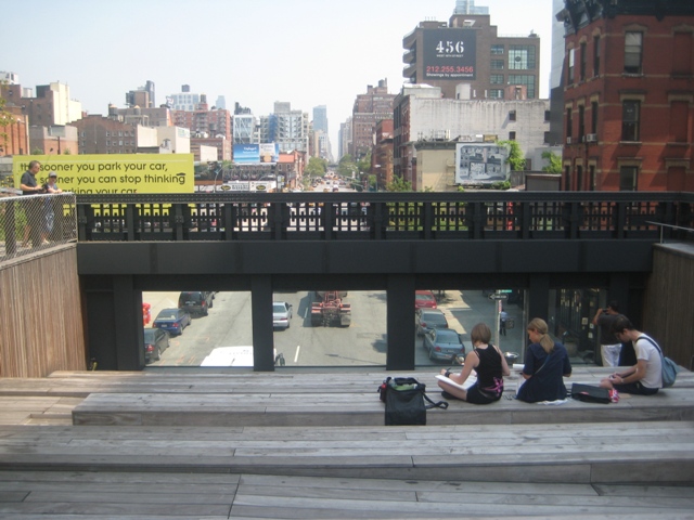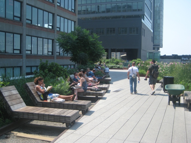 Em seguida rumamos para uma das novas atrações na cidade: O High line Park. Em mais uma ideia ousada, dessa cidade que não para de reinventar, essa antiga linha de trem suspensa abandonada foi totalmente revitalizada e transformada em parque, se tornando em um dos pontos preferidos de lazer dos moradores próximos. Ele fica praticamente sobre a 10ª avenida, mas nem todas as esquinas têm escada para subir, portanto é importante consultar o mapa antes para não ter que andar à toa. Se você está com carrinho de criança, ou não tem condições de subir toda aquela escadaria (a subida é bem razoável), nas esquinas da 16th e 14th existem elevadores. O parque é bem bonito, com bancos de madeira estilosos e belas flores. A vista lá de cima também é bem bonita e esse é um ótimo local para descansar um pouquinho e curtir o movimento. Tem muita gente que aproveita o local para ler, estudar ou apenas conversar com os amigos.