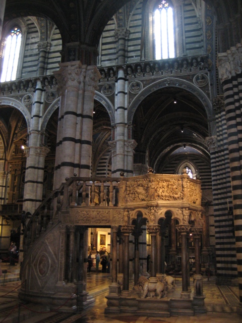 O Duomo foi construído no século XIII e já passou por diversas reformas e expansões. Por fora já é muito bonito, mas é quando você adentra sua estrutura que você se encanta. Todos os pilares da nave principal são de mármore branco e preto listrado, o que é bem original e dá um toque diferente ao visual. O piso também é formado por vários painéis de mármore todos trabalhados e lindíssimos, sendo alguns inclusive protegidos por corda para você não pisar e estragar a obra. As paredes também são verdadeiras obras de arte, assim como o púlpito de Nicola Pisano. No canto esquerdo da nave você encontra uma passagem para a biblioteca Piccolomini, que é de uma beleza impressionante! São vários afrescos de Pinturicchio ao redor de toda a sala em homenagem ao Papa Pio II, além de um teto todo trabalhado. É arte para todo lado que você olha!
