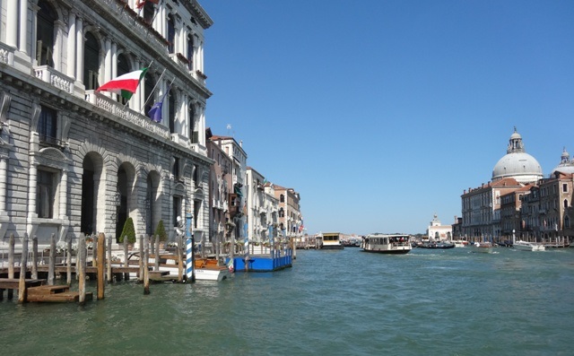 Ao final do dia resolvemos pegar o Vaporetto para voltar até a Piazzale Roma, onde se encontrava o ponto do nosso ônibus para o retorno a Mestre. Além de poupar suas pernas de ter que atravessar novamente a cidade, o que criança pode ser essencial, a viagem no Vaporreto pelo Grande Canal é uma atração por si só, pois você vai observando paisagens belíssimas. Recomendo ir para a parte de trás, pois é a única parte aberta e permite você observar melhor tudo ao redor, além de tirar belas fotos sem um vidro na frente. O preço por pessoa de €7,50 é bem caro se você considerá-lo apenas como um transporte, mas se considerá-lo também como um passeio de barco pelos canais de Veneza não é tão caro assim, já que muitas atrações custam mais do que isso. O único lado chato é que o Vaporetto é como se fosse um ônibus aquático mesmo, portanto vai parando o tempo todo e demora muito para percorrer uma boa distância. Levamos quase 1 hora da Praça São Marcos até a Piazzale Roma, portanto não é um transporte para quem está com muita pressa. Existem opções mais rápidas, como as lanchas táxi, mas que são muito caras e só recomendo para quem não tem opção ou está em um grupo grande.