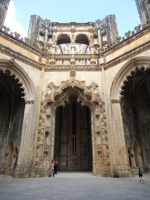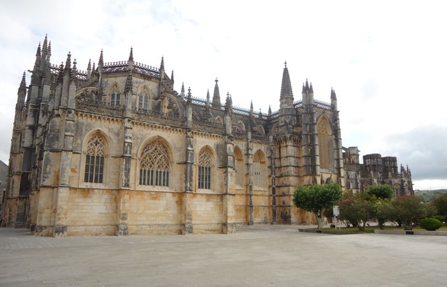 Para quem chega de carro, é bem fácil estacionar próximo ao mosteiro, mesmo em julho, quando já é alta estação. A arquitetura gótica externa é um espetáculo e já impressiona logo na chegada, não só pela beleza, mas pelo tamanho da estrutura. A construção do mosteiro foi iniciada em 1386 por D. João I como uma forma de agradecimento à Virgem Maria pela vitória na Batalha de Aljubarrota. No entanto, sua estrutura ainda demoraria dois séculos para chegar ao estágio atual. A visita começa pela Nave Principal, que apesar de sua grandiosidade e importância, não é a parte mais bonita do mosteiro. Essa é a única parte gratuita do passeio, já que para as partes restantes é necessário pagar um ingresso.