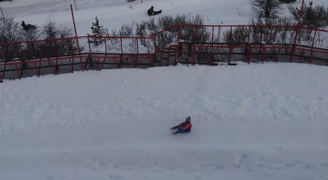 Na verdade a subida até o Refugio Lynch acontece em duas etapas. A primeira, feita no teleférico fechado, você chega até uma estrutura com bar fechado e várias mesas ao ar livre para contemplar o visual. Nesse ponto já tem muita neve e as crianças se divertem bastante fazendo esquibunda, caso você tenha comprado a prancha na base como eu mencionei, ou então simplesmente fazendo guerra de neve. Também é possível tirar fotos com bonecos de neve, mas é pago a parte para o fotógrafo.