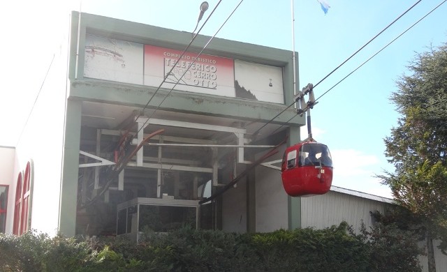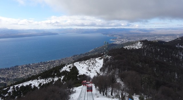 Em seguida partimos para a principal atração do Cerro Catedral para quem não pretende esquiar, ou está visitando-o durante a baixa temporada, que é o teleférico fechado que te leva até ao topo da montanha onde fica o Refugio Lynch, também conhecido como Cable Carril, portanto é só seguir as placas para chegar lá. Em junho de 2014 o preço era de 140 pesos para adultos e 95 para crianças. O lado negativo desse teleférico é que só cabem um pouco mais de 20 pessoas e só existem dois, um subindo e outro descendo, portanto dependendo da quantidade de turistas a espera pode ser grande. Nós tivemos que esperar mais de 1 hora, mas outros turistas comentaram com a gente que chegaram a esperar mais de 2 horas, portanto o ideal é comprar o ingresso logo para garantir o lugar. Levamos em torno de 15 minutos para chegar lá em cima e o visual da subida é bem bacana! Quanto mais alto, mais neve víamos.