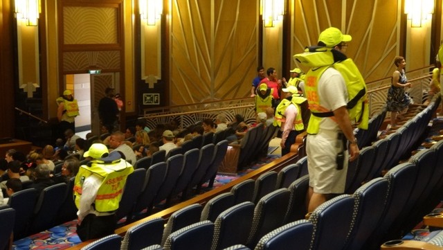 Uma parte chata, mas ao mesmo tempo importante do cruzeiro, é o simulado. Antes de o navio zarpar, todos são obrigados a pegar seus coletes salva-vidas nos armários das cabines e se dirigir ao seu ponto de encontro no momento em que eles tocam o alarme simulado. Para descobrir para onde se dirigir, basta olhar no informativo grudado atrás da porta da cabine, ou então perguntar para um dos muitos funcionários nos corredores do seu deck. O nosso ponto de encontro era no cinema e lá eles passaram mais informações importantes para qualquer eventualidade.